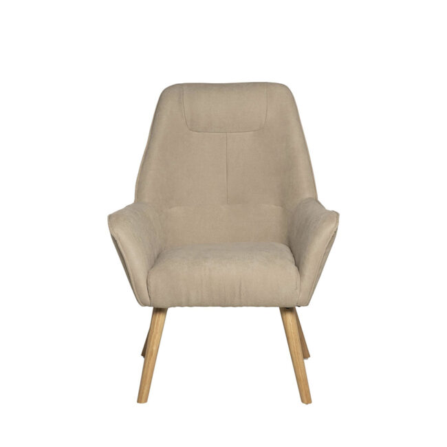 Butaca tapizada en color beige con patas ligeramente inclinadas en madera acabado natural.