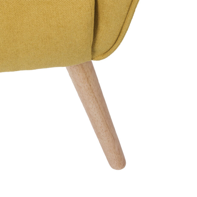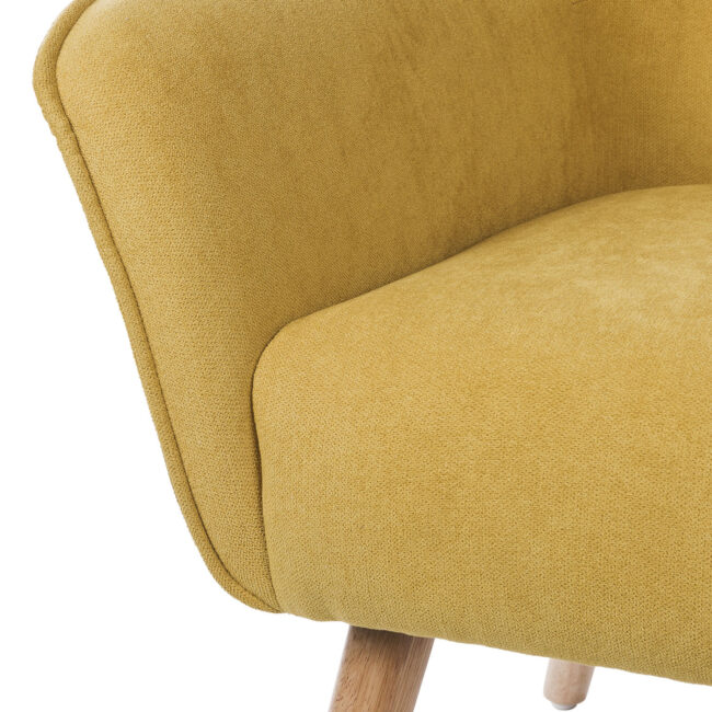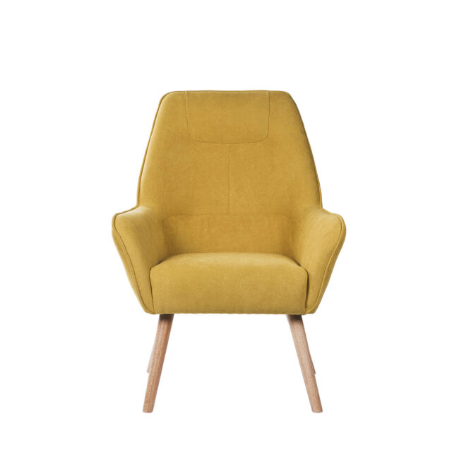 Butaca tapizada en color mostaza con patas ligeramente inclinadas en madera acabado natural.