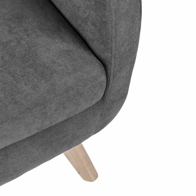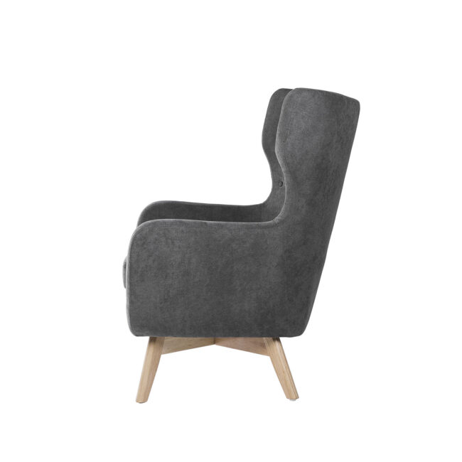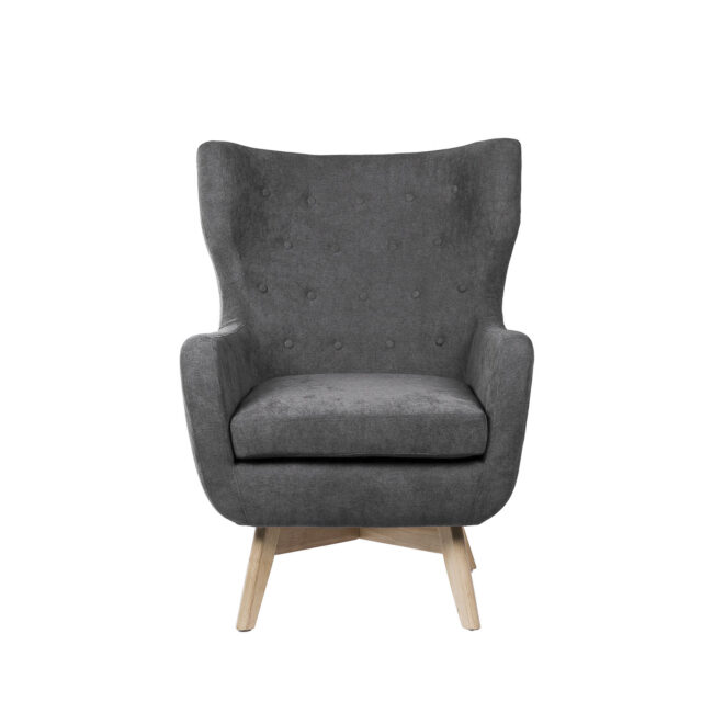 Butaca tapizada en color gris oscuro con patas de madera ligeramente inclinadas acabadas en color natural.