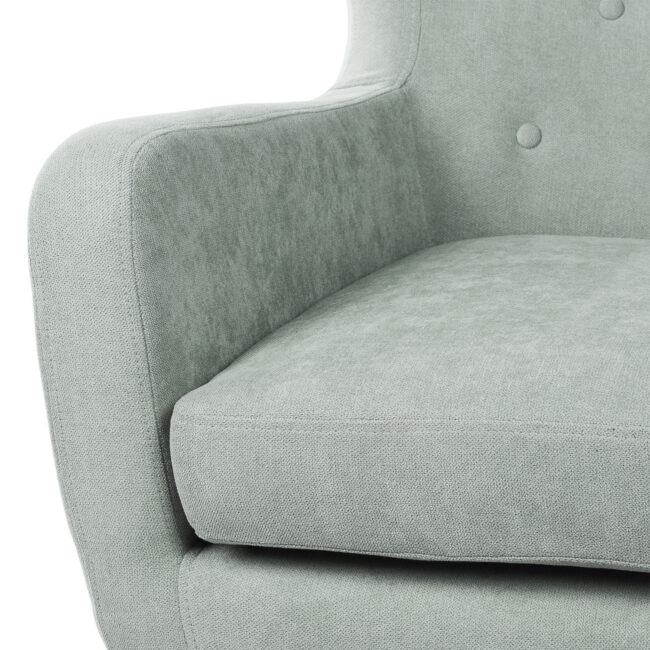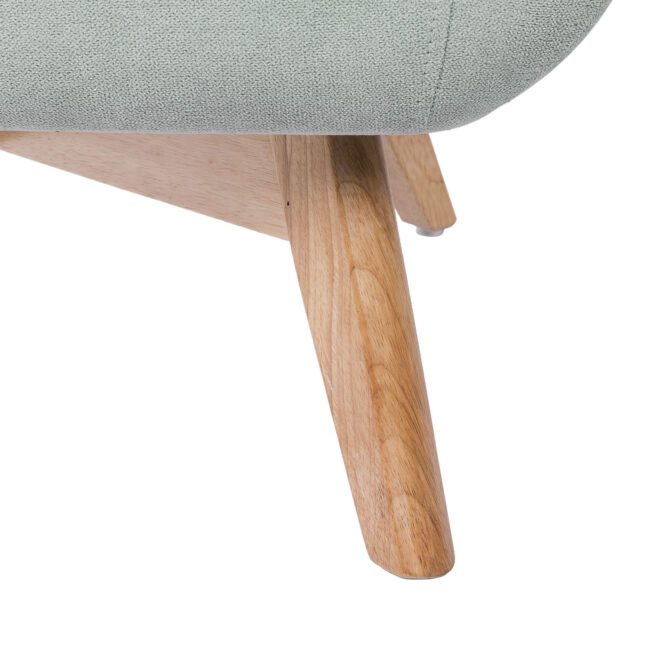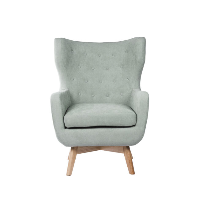 Butaca tapizada en color menta con patas de madera ligeramente inclinadas acabadas en color natural.