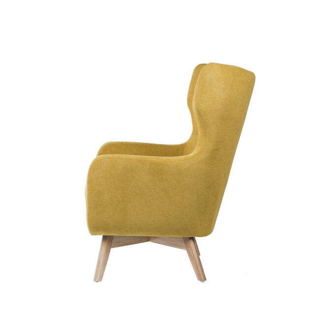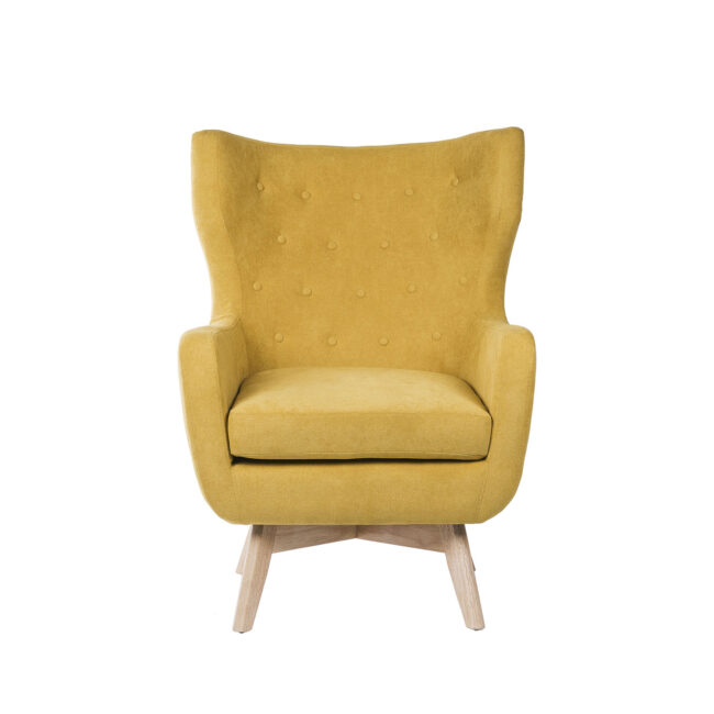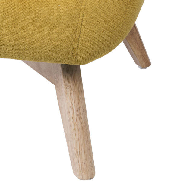 Butaca tapizada en color mostaza con patas de madera ligeramente inclinadas acabadas en color natural.