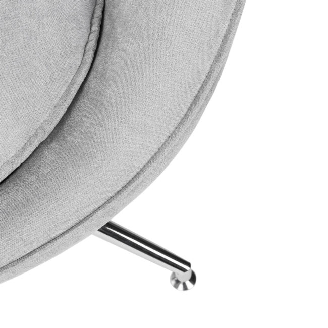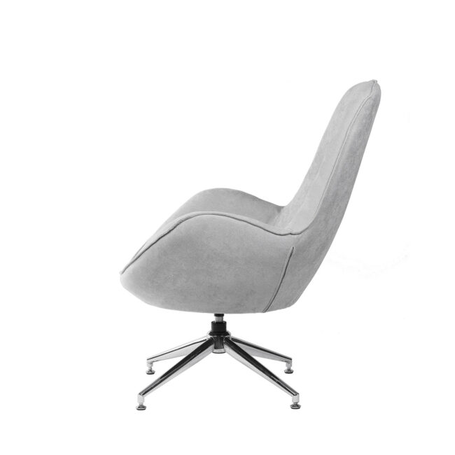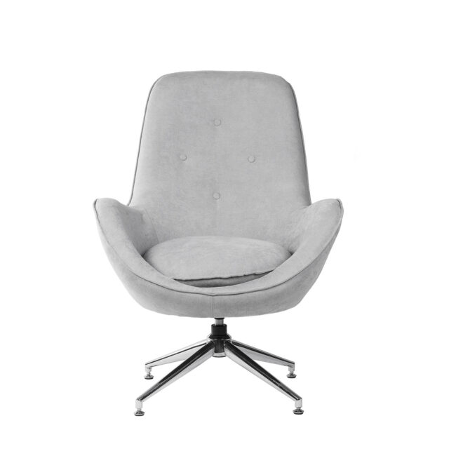 Butaca tapizada en color gris claro con base giratoria metálica en acabado cromado.