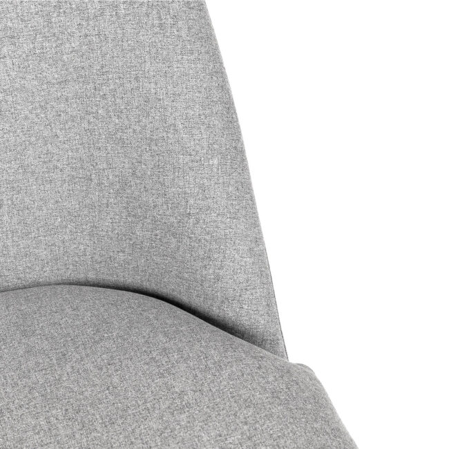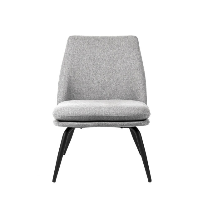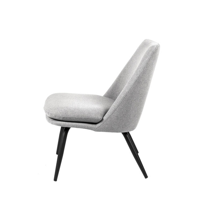 Butaca tapizada en color gris claro con patas ligeramente inclinadas en metal acabado en color negro.