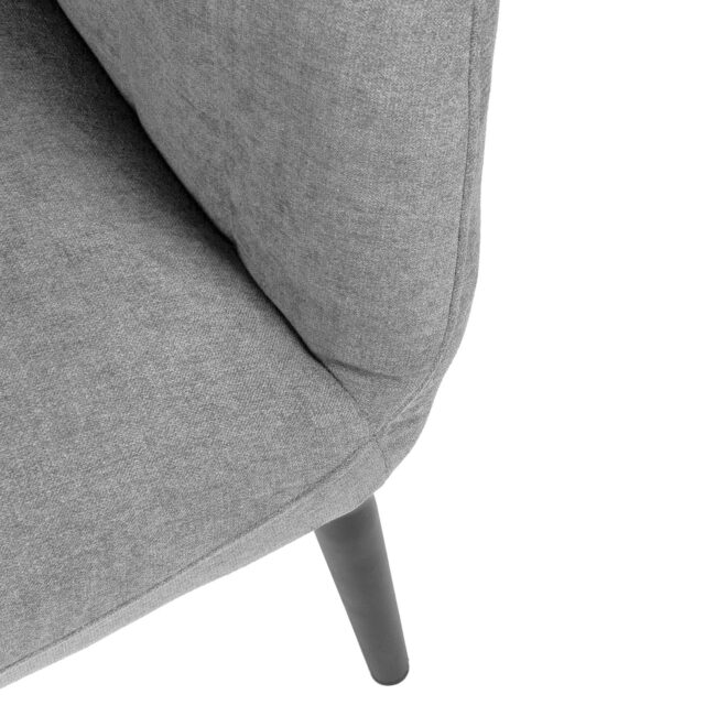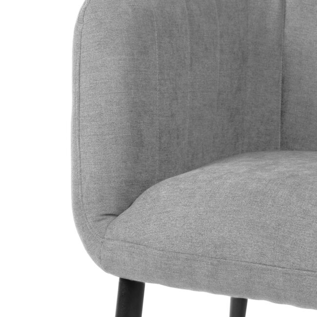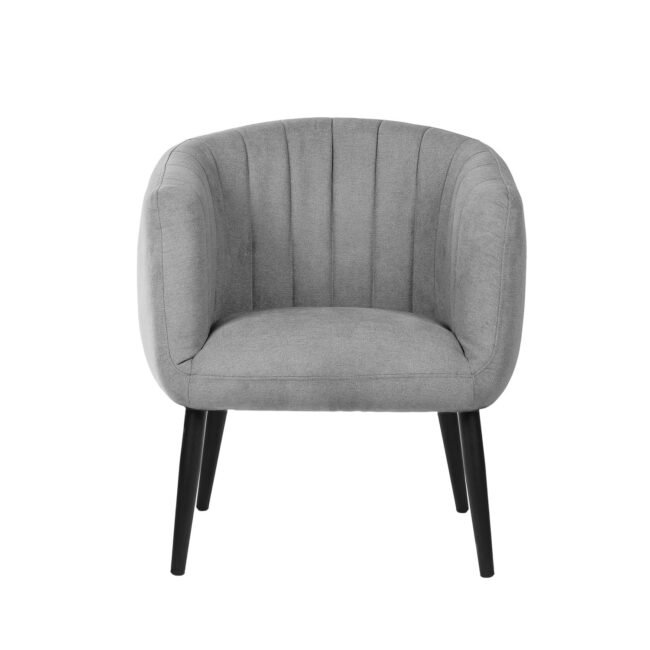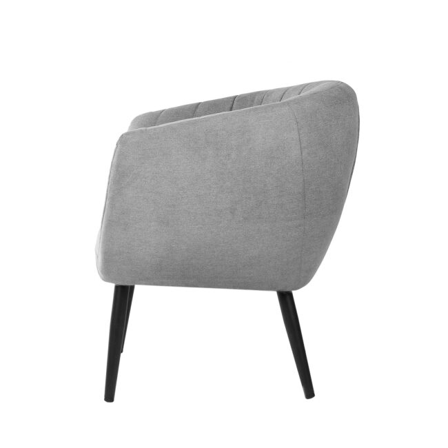 Butaca tapizada en color gris claro con patas de metal acabado en color negro.