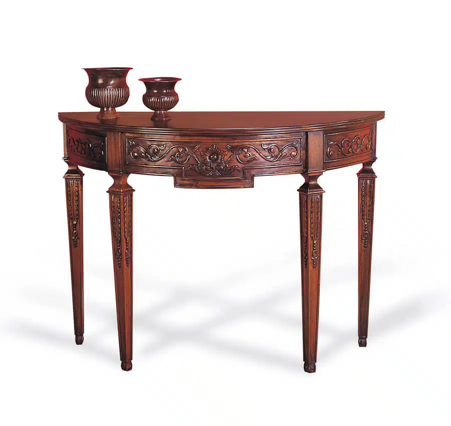 La consola Francesa es una pieza de mobiliario elegante y sofisticada que añadirá un toque clásico o vintage a la entrada de tu hogar. Realizada en caoba maciza por expertos artesanos, esta consola está exquisitamente tallada a mano con una atención meticulosa al detalle en su acabado.