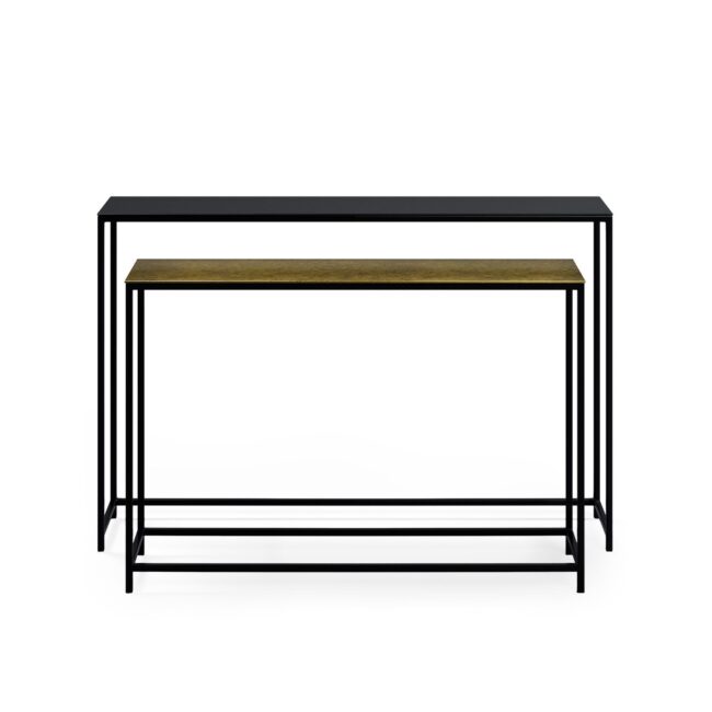 Esta versión más sobria de la consola Thiennes, también en estilo art déco, resalta por su equilibrio entre diseño curvo y estructura firme. Fabricada en travertino y dm en tono marrón claro, es una pieza funcional que viste con sutileza cualquier rincón.