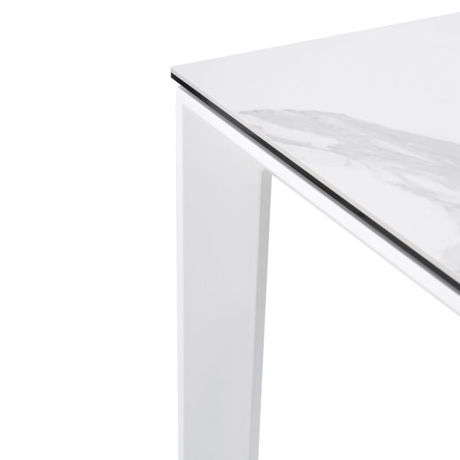 Mesa extensible de acero en color blanco y tapa porcelánico mármol creta (porcelánico 5mm + cristal templado 8mm).