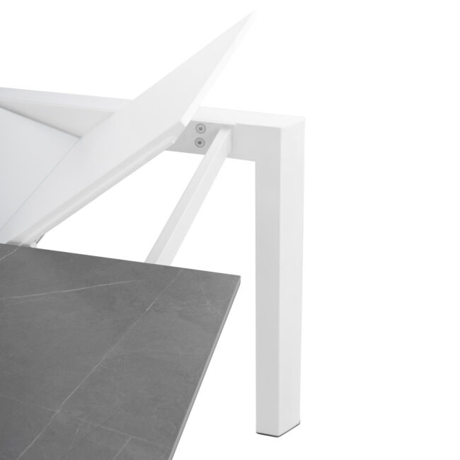 Mesa extensible de acero en color blanco y tapa porcelánico gris atenea (porcelánico 5mm + cristal templado 8mm).