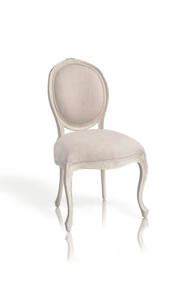 El estilo chic romántico, vintage eminentemente afrancesado de esta silla la convierte en una pieza única y encantadora. El tapizado en la tela de la imagen, una mezcla de lino y poliéster, añade textura y suavidad al asiento, lo que la hace cómoda y atractiva a la vista.