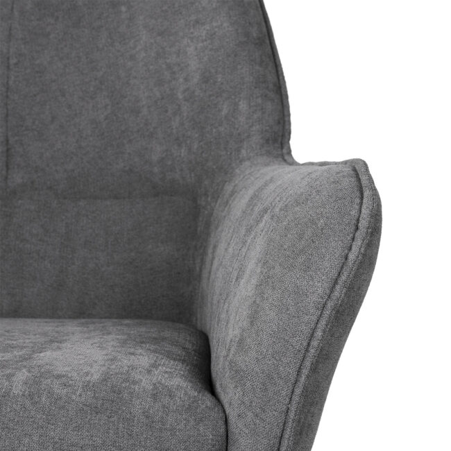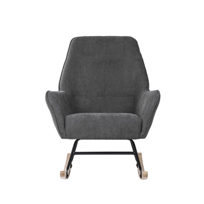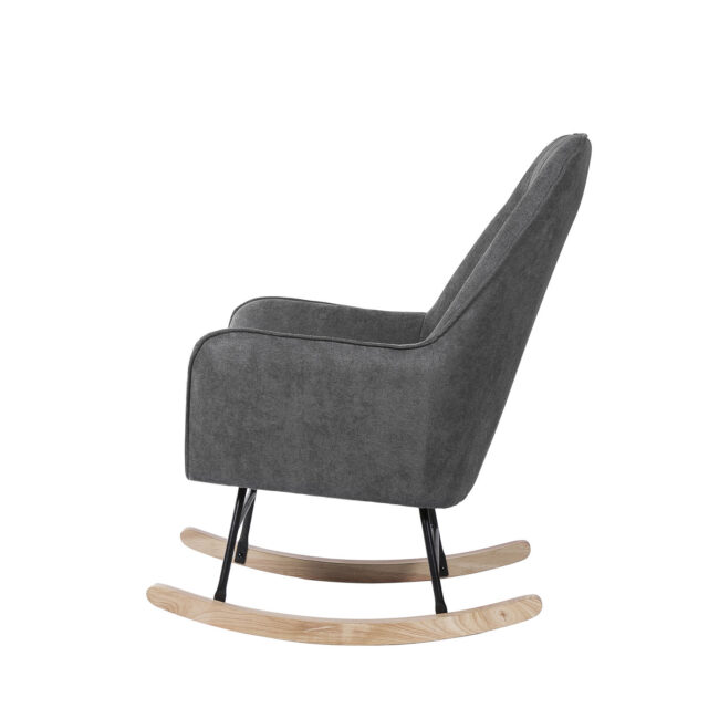 Mecedora tapizada en color gris oscuro con estructura de acero en color negro y patín de madera acabado natural.