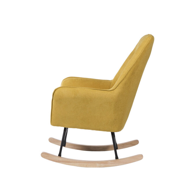Mecedora tapizada en color mostaza con estructura de acero en color negro y patín de madera acabado natural.