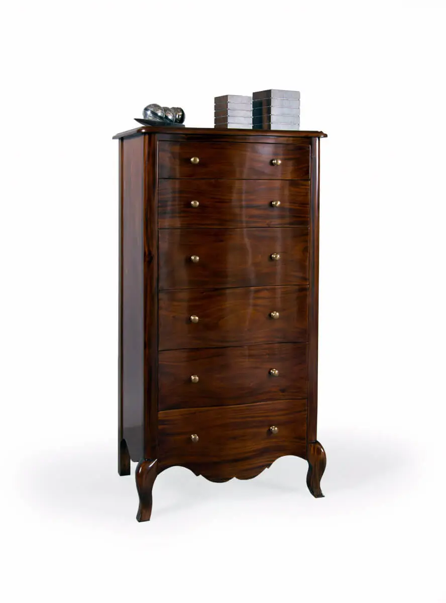 Sin embargo, existe una buena solución para combatir la escasez de espacio en el dormitorio, se trata del sifonier que os presentamos a continuación. Este mueble de estilo clásico, elaborado en caoba maciza, es bastante amplio y cuenta con cajones, lo que lo convierte en una opción muy práctica. Además, es capaz de combinar perfectamente con ambientes clásicos y vintage, pero también puede ser una pieza interesante en decoraciones más modernas.