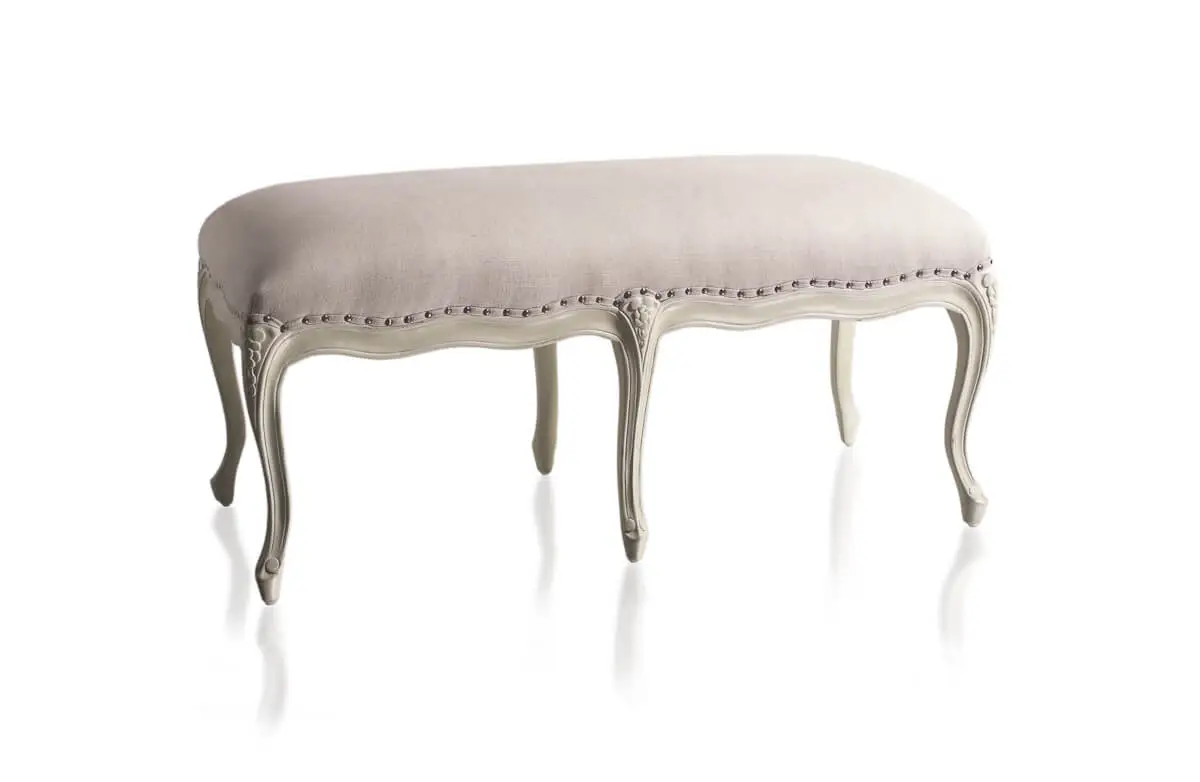 El estilo chic romántico, vintage afrancesado del taburete se fusiona a la perfección con su elegante glamour, aportando un toque de encanto y personalidad a tu espacio. Su presencia añadirá un elemento visualmente atractivo y refinado al pie de la cama, creando un ambiente acogedor y estilizado.